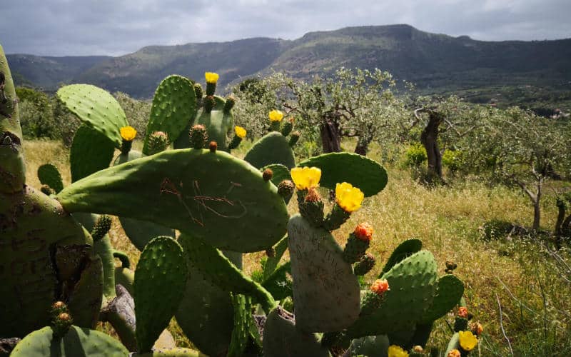 - Wir fahren an Steineichen, Pinien, Olivenbäume, Palmen und Feigenkakteen vorbei.