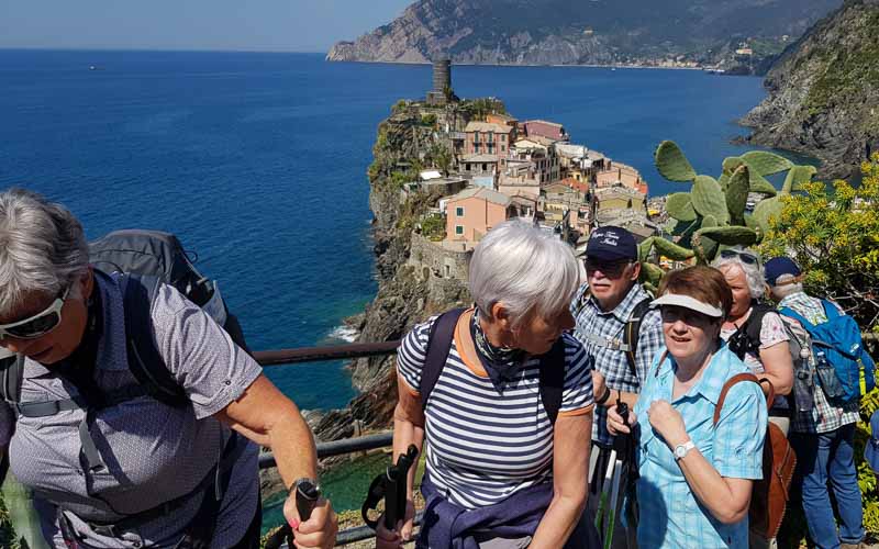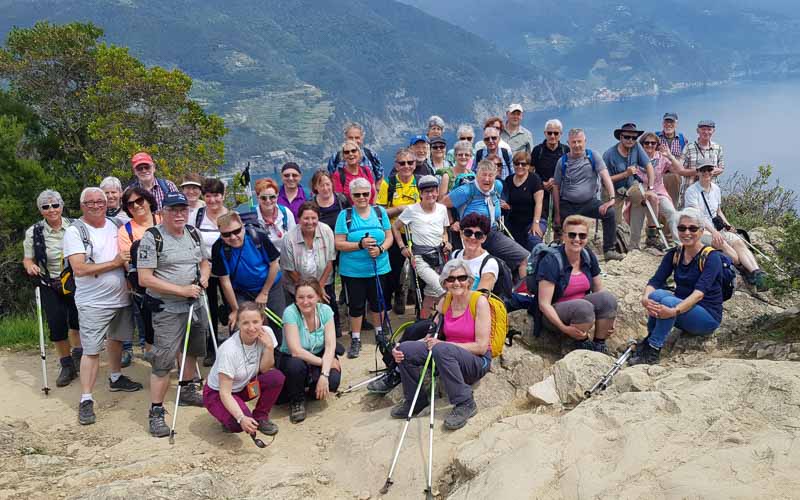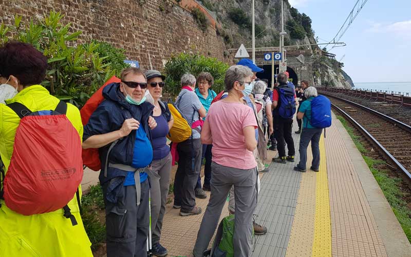 Mit viel Vorfreude und bei strahlendem Sonnenschein steigen wir in Levanto aus dem Bus. Silvia und eine neue rassige Wanderleiterin namens Claudia erwarten uns bereits beim Parkplatz. Heute wandern wir in den Cinque terre. Es besteht aus fünf malerischen, verträumten Dörfern an der ligurischen Riviera. Nach einem kurzen Aufenthalt in Levanto, dem Tor zur Cinque Terre, besteigen wir die Bahn nach Vernazza. Dieses Dorf hat das bekannteste Fotomotiv der Cinque Terre zu bieten. Die kleine Halbinsel um das romantische Hafenbecken mit den bunten Fischerbooten und den antiken Burgtürmen ist Symbol für die faszinierende Schönheit dieser Gegend. Dieser Ort hat das noble und elegante Aussehen und die Charakteristik am besten bewahrt. Die beiden Wanderleiterinnen erklären uns einiges zu Vernazza. Danach bleibt auch hier wieder Zeit, diese spezielle Atmosphäre etwas zu geniessen bevor wir uns auf die Wanderung begeben. Es geht auch heute wieder ziemlich bergauf durch Weinberge und Olivenhaine bis nach Corniglia welches als einziges Dorf nicht am Meer, sondern 90 Meter über den Klippen liegt. Die Wege führen durch eine abwechslungsreiche unberührte Natur, die „macchia mediterranea“. Ein atemberaubender Ausblick auf das Meer und die schroff abfallende Küste dieses unter Naturschutz stehenden Abschnitts der Ligurischen Riviera macht unsere Wanderung zum unvergesslichen Erlebnis. In Corniglia angekommen finden alle ein Plätzchen nach ihrem Gusto, um eine Kleinigkeit zu essen bevor wir dann wieder mit der Bahn zum Ausgangspunkt fahren. Vor dem Abendessen wird auf der Dachterrasse unseres Hotels die schöne Stimmung genossen oder am Strand doch tatsächlich noch einen Sprung ins bereits angenehme Nass des Meeres gewagt.
