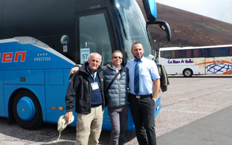 Ja, Kurven weist das hügelige oder teilweise gebirgige Sizilien viele auf. Hier als Reiseleiter während der Fahrt Kaffee und andere Getränke zu servieren, bedarf schon einiger akrobatischer Fähigkeiten. Was jedoch von Busfahrer Arun mit seinen fahrerischen Künsten geboten wird, erstaunt die Gäste immer wieder von neuem. In den engsten Kurven und Gassen dirigiert er seinen 12 m langen Bus mit bewundernswerter Ruhe. Nervöses Hupen der sizilianischen Autofahrer, an unmöglichsten Orten parkierte Autos, gefährlich uns überholende Fahrzeuge: Kein Problem für Arun!