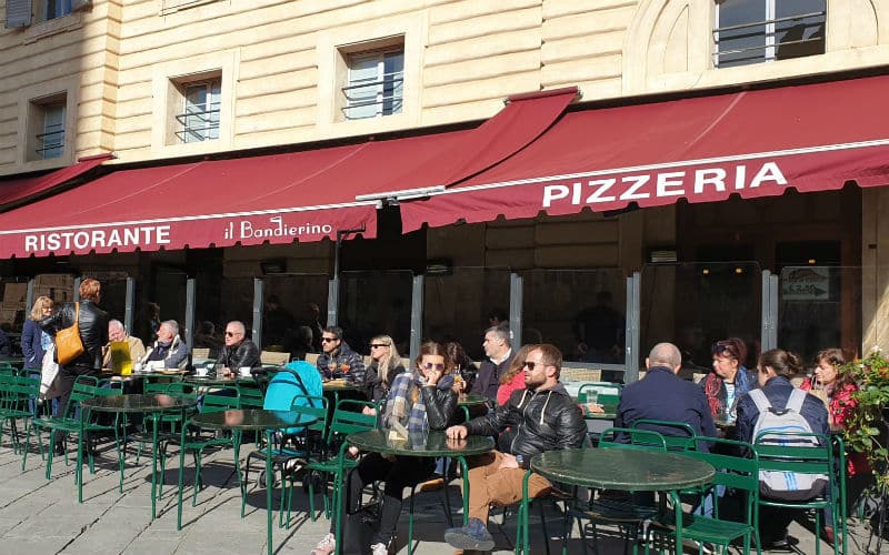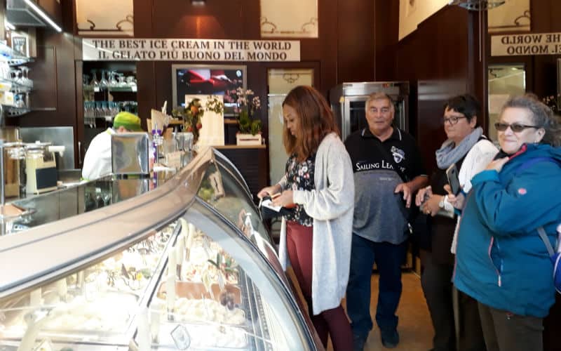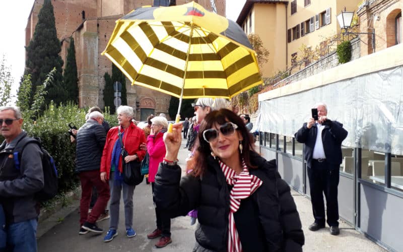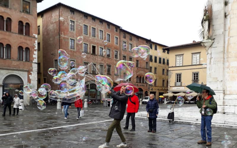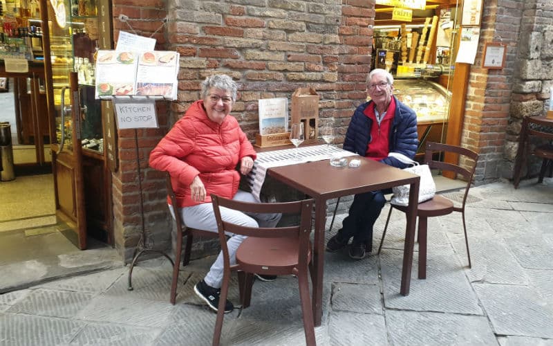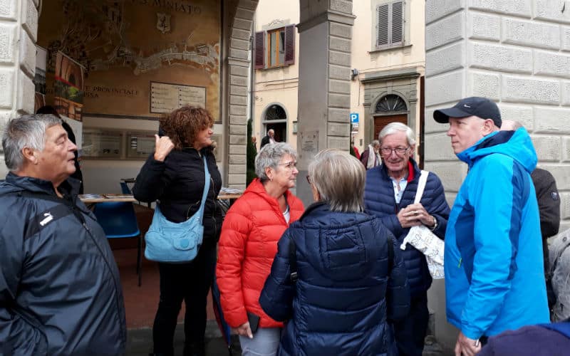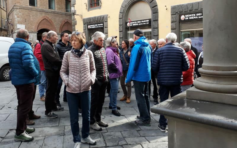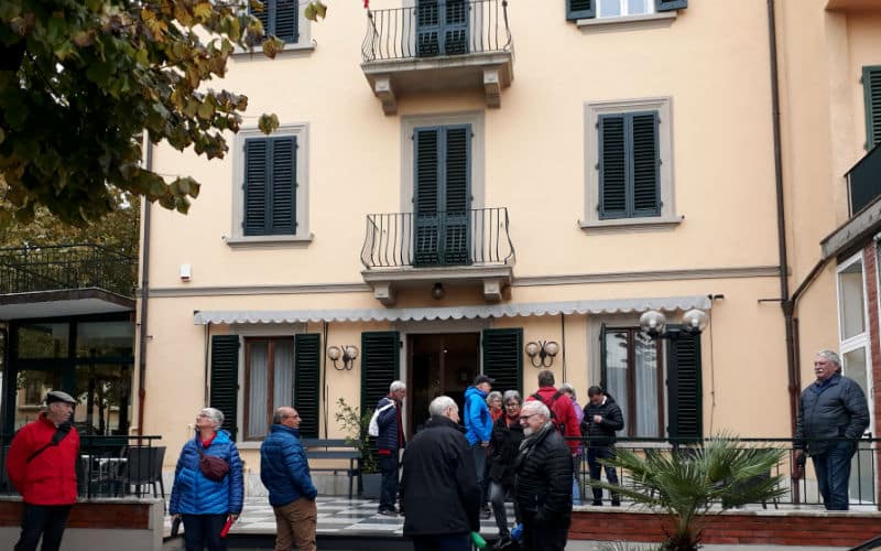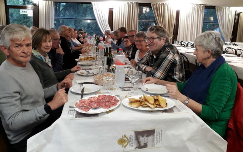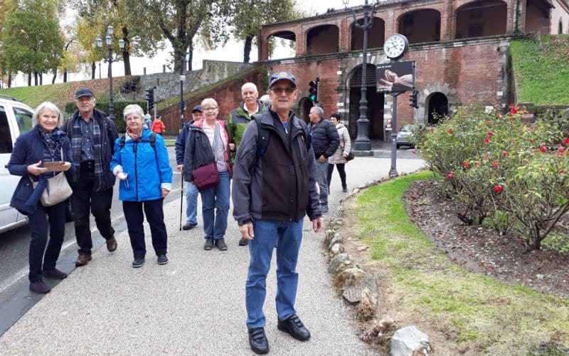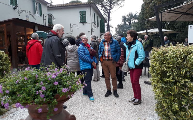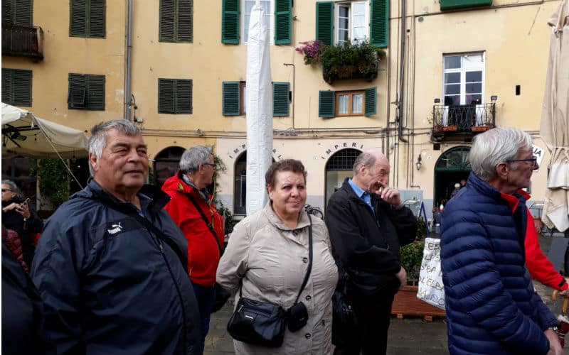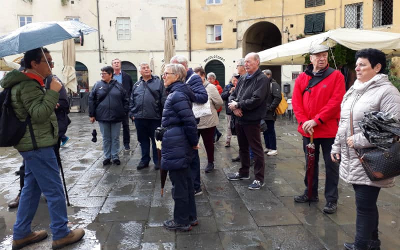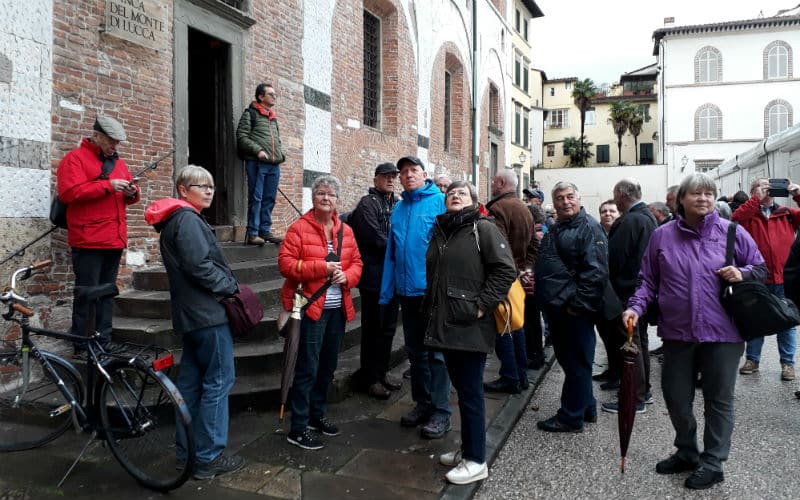 Am Morgen des 2. Reisetages goss es wie aus Kübeln. Auf dem Programm stand die mittelalterliche Stadt Luca, umgeben von der längsten, intakt erhaltenen Festungsmauer Europas. Gut gelaunt traten wir die Reise an und fanden in Massimo einen freundlichen und kompetenten lokalen Reiseleiter, der uns in Luca zeigte, was sehenswert war. Unterbrochen wurde die Stadtführung mit einem „Ausflug“ in ein grosses, schönes und typisch italienisches Café beim Dom. Auf der „Piazza del Mercato“, dem Marktplatz, zeigte sich dann etwas die Sonne und es war sogar möglich, das Mittagessen im Freien zu geniessen. Welche Wohltat! Anschliessend war ein weiteres Highlight angesagt: Der Besuch eines typischen Landgutes mit Olivenöl- und Weindegustation sowie Imbiss. Ein voller Erfolg! Und die Gäste genossen es noch nach Lust und Laune in der „Cantina“ des Landgutes einzukaufen. Entsprechend gelöst und entspannt war dann auch die Stimmung im Bus auf der Rückreise. Nur für das Abendessen im Hotel war der Platz im Magen etwas knapp.