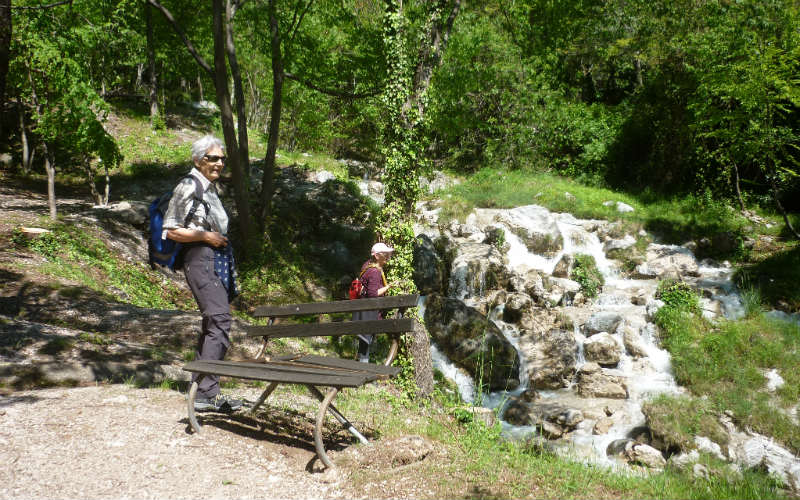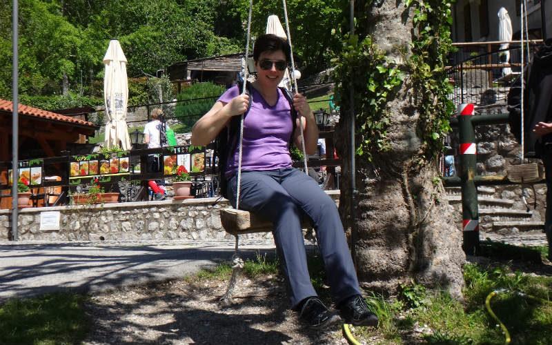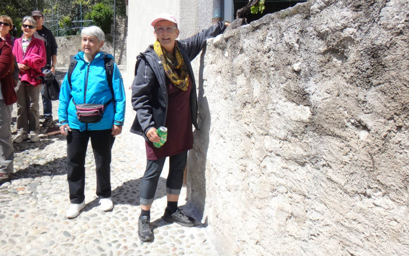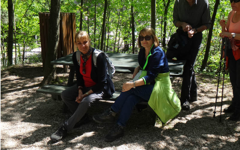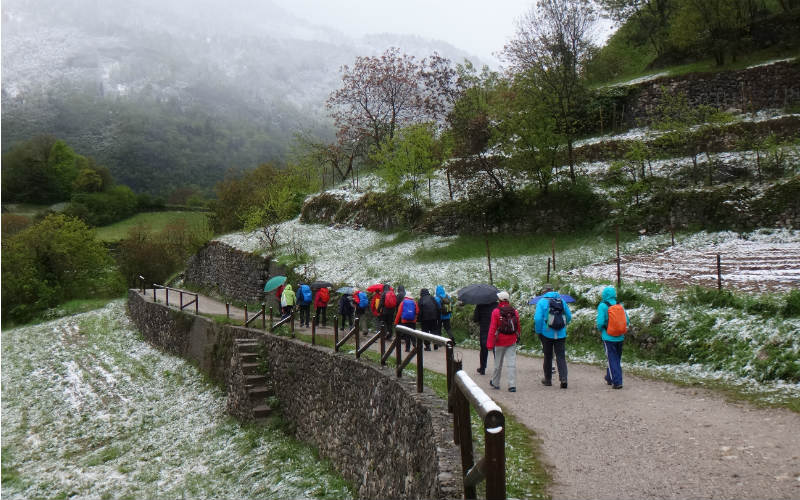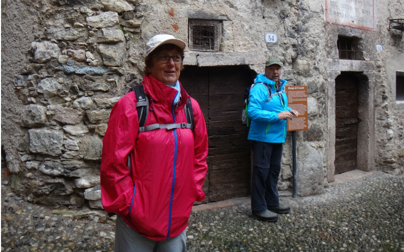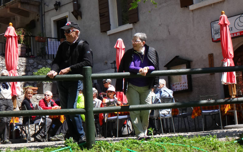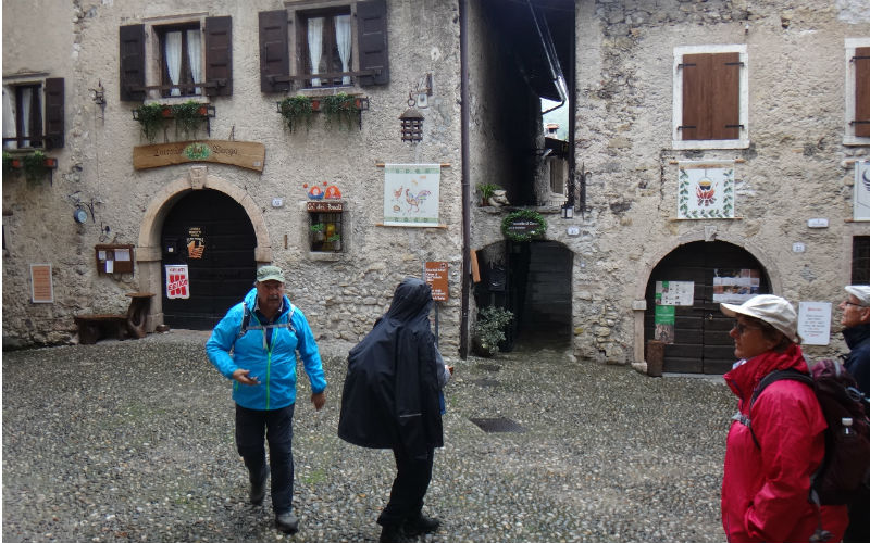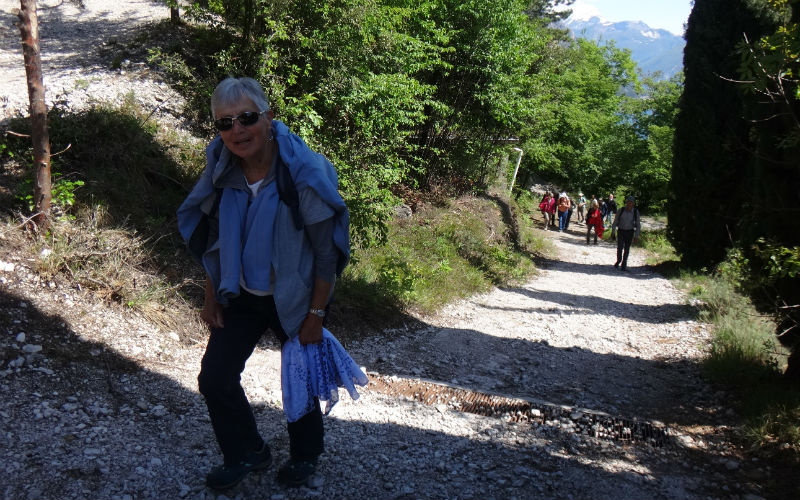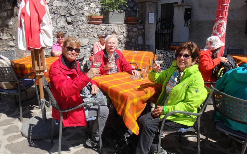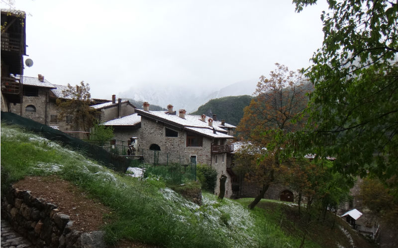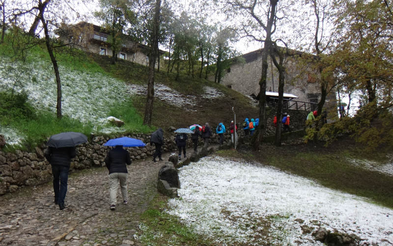 Der nächste Tag fängt stürmisch an. Es windet und regnet in Strömen. Gemäss Wetterprognose soll es gegen Mittag ruhiger werden, was sich beim Frühstück niemand wirklich vorstellen kann. Einige Gäste entscheiden sich daher, lieber einen gemütlichen Tag im Hotel oder in Limone zu verbringen, als ins stürmische Wetter hinauszugehen. Später erzählten sie mir, dass sie am Gardasee waren und noch nie so hohe Wellen an einem See gesehen hätten. Wir anderen fahren los und hoffen wenigstens auf trockenes Wetter. In der Nacht auf Sonntag gab es auch am Gardasee bis in die tiefen Lagen Schnee und gemäss Gabriela, unserer Wanderführerin, hat es im ganzen Winter nie so viel geschneit wie jetzt im Mai. Alle Berge um uns herum sind mit weissem Puder überzogen, was wunderschön aussieht. Nach einer kurzen Busrundfahrt, um die schneebedeckten Berge noch richtig geniessen zu können, fahren wir nach Canale. Das mittelalterliche Dörfchen gilt als eines der schönsten Dörfer Italiens. Zum Glück hat das Künstlerhaus offen, denn es wird von Freiwilligen geführt und öffnet unregelmässig. „La Casa degli Artisti” ist nach dem Kunstmaler Giacomo Vittone benannt und Wohn- sowie Begegnungsstätte für Künstler aus ganz Europa. Wir bewundern das schöne Haus und natürlich die Skulpturen und Bilder von den verschiedenen Künstlern. Gestärkt mit kulturellen Eindrücken starten wir danach unsere Wanderung. Zu unserem Erstaunen tropft es nur noch ab und zu. Der Wind hat sich auch weitgehend beruhigt und so gelangen wir auf einem schönen Wanderweg zum Lago di Tenno, der ein kleiner See mit smaragdgrüner Farbe ist. Einfach ein wunderbarer Ort!